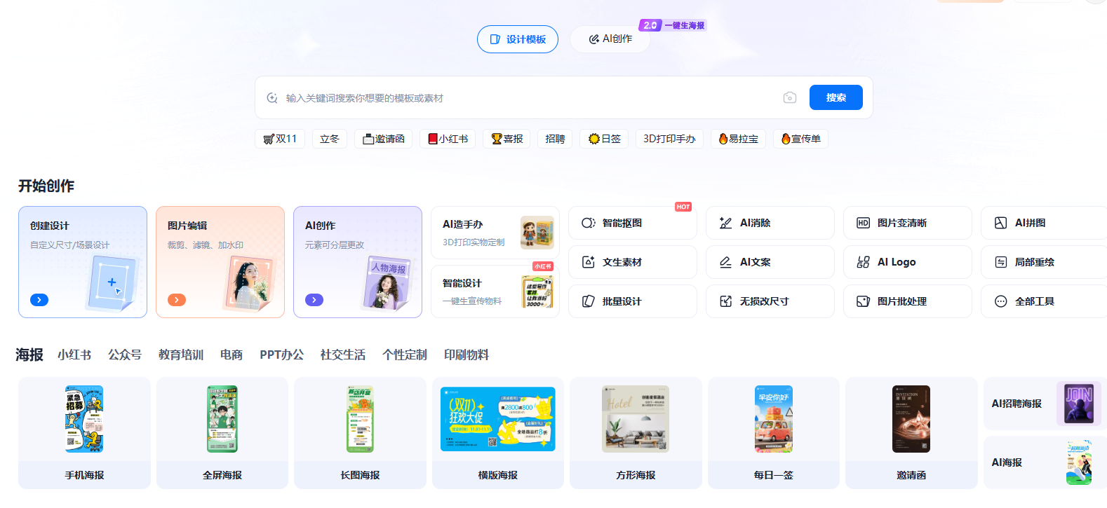 • AI深度赋能设计全流程:创客贴很早就开始在AI领域布局,其AI功能并非零散的工具,而是深度融入从图片生成、抠图到批量设计的各个环节,能显著提升创作效率。