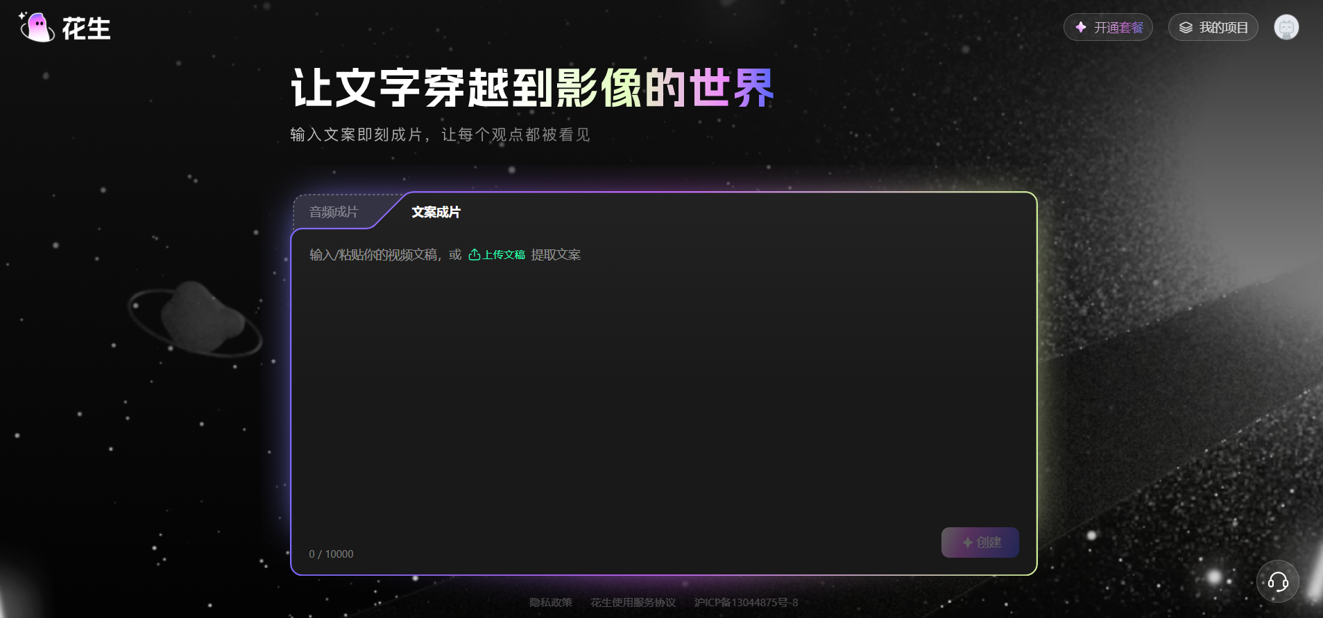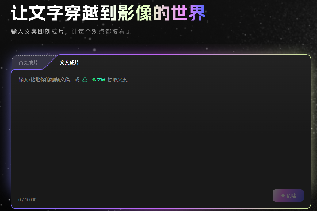 选择模式创建:选择“文案生成视频”或“音频生成视频”模式,输入文案(200-5000字)或上传音频文件。