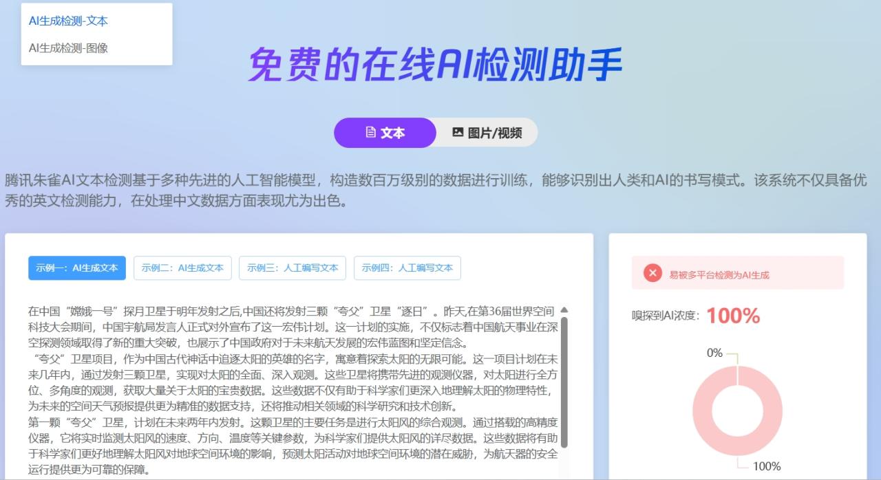 2025年初,腾讯混元安全团队推出朱雀AI检测助手,这款工具能够快速识别AI生成的文本和图像,迅速成为内容创作者、教育机构和企业的标配工具。
