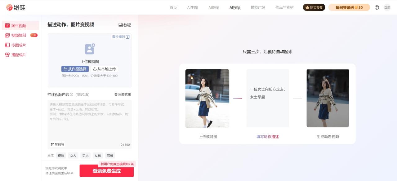 访问绘蛙AI官网(www.ihuiwa.com),注册登录后进入AI视频工具界面。选择“单图生成视频”或“多图成片”功能,上传符合要求的商品图片。