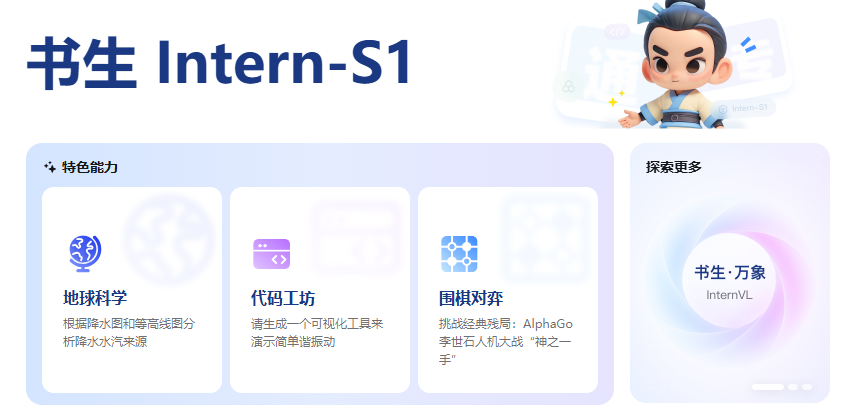 | 科学多模态 (Intern-S1) | 专为科研设计,能解析分子式、蛋白质结构等科学数据。 | 辅助科学研究,如化学材料分析、地震波识别等。 |