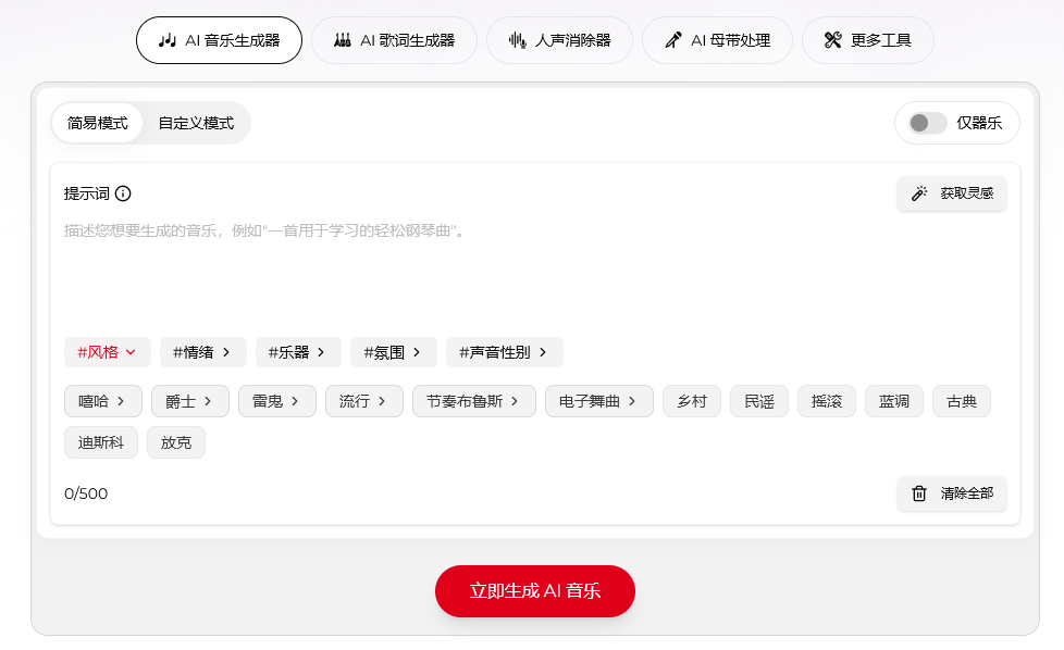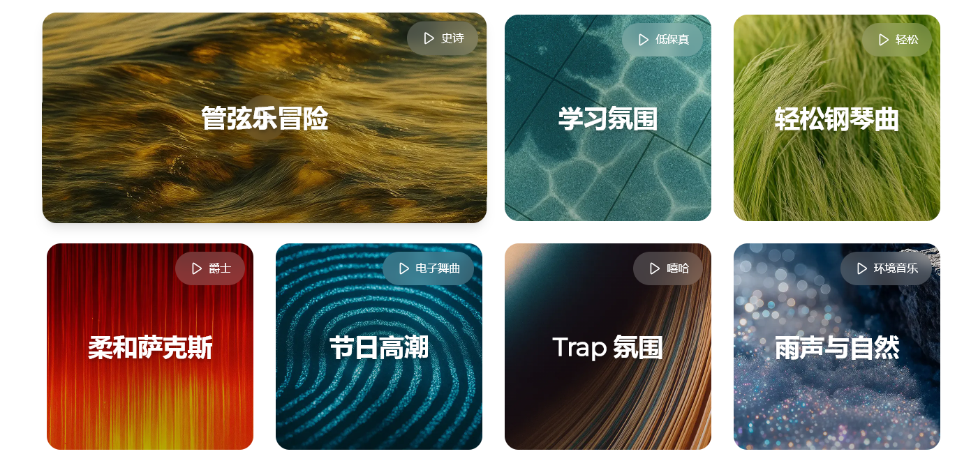 | 文本生成音乐 | 支持通过输入文本描述或歌词,生成完整的音乐曲目。 |
