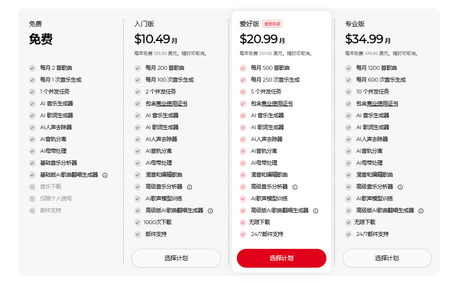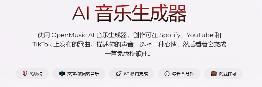 | 免版税商用 | 所有生成的音乐曲目均为免版税,并附带商业许可证,用户可自由用于视频、播客等商业项目。 |