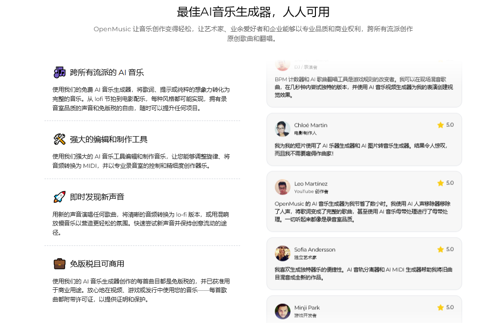 OpenMusic AI通过其强大的AI能力和用户友好的设计,让音乐创作不再是专业人士的专利,为广泛的创作者群体提供了极大的便利。