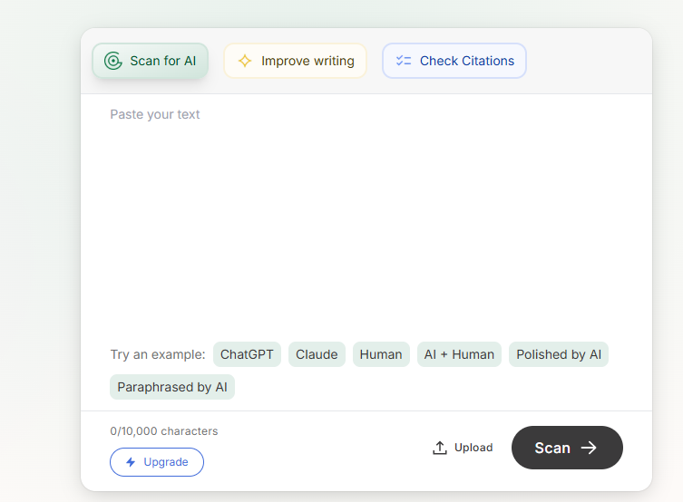 AI文本扫描:支持直接粘贴文本或上传文件(如PDF、DOCX)进行检测,并能给出整体AI概率百分比和置信度。