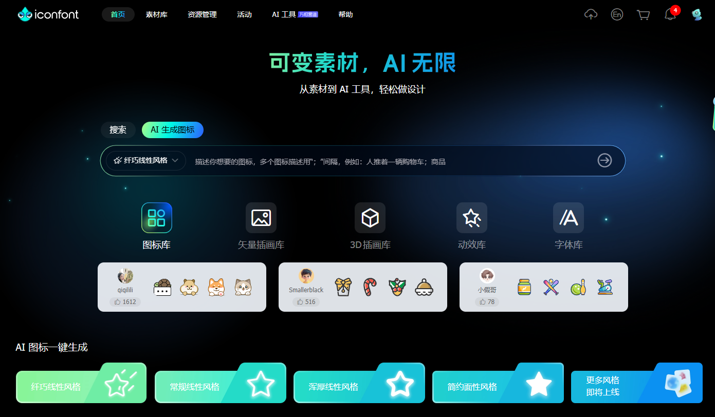 Iconfont 是阿里巴巴旗下知名的矢量图标平台,近年来也融入了AI技术来增强其功能。